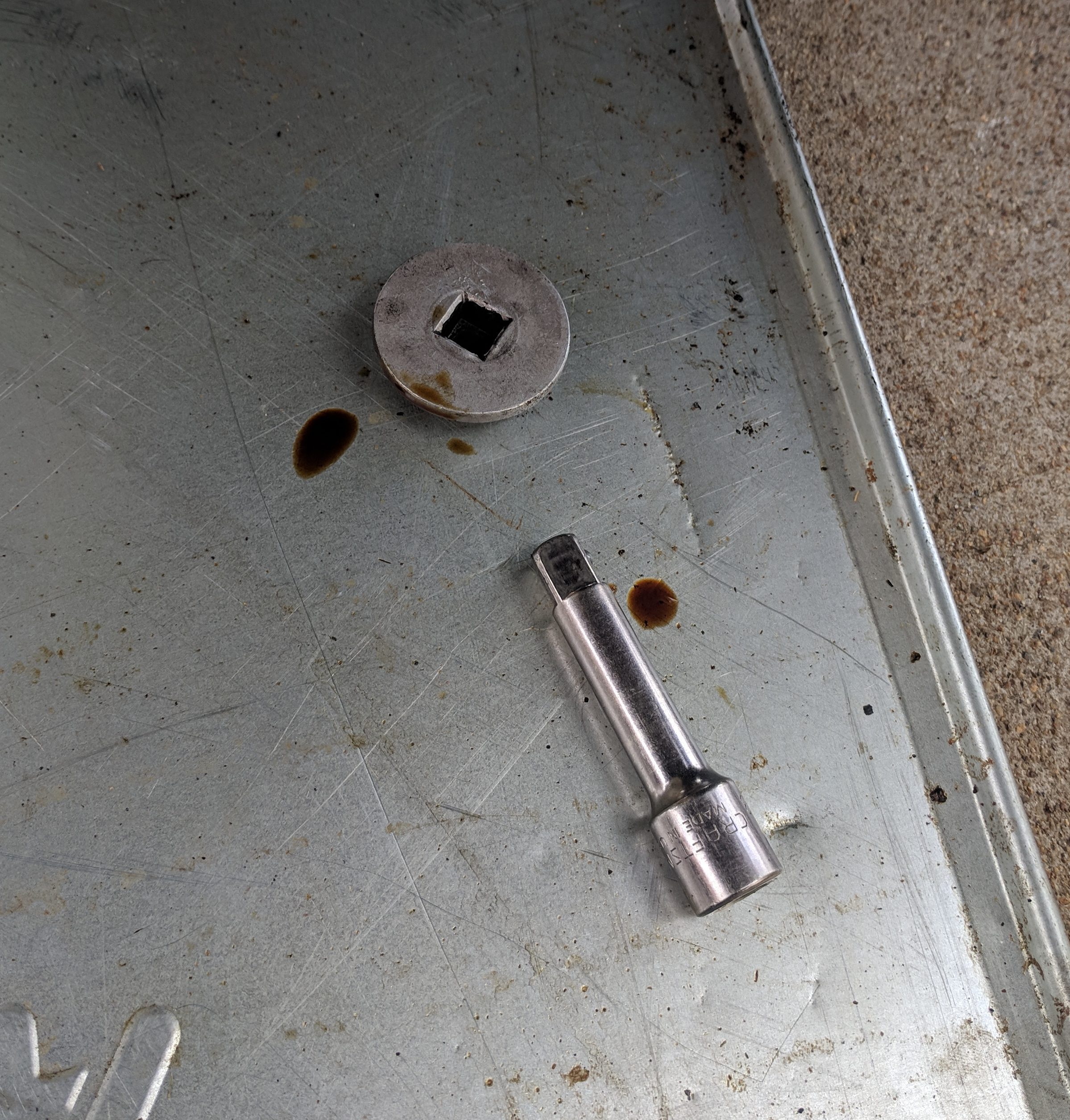 The other tip from draining oil is to use an oil drip pan underneath everything while you are working. The big 5-gallon bucket will catch all the oil, but you will always need a place to place your tools and drain plug down that might have oil on it.