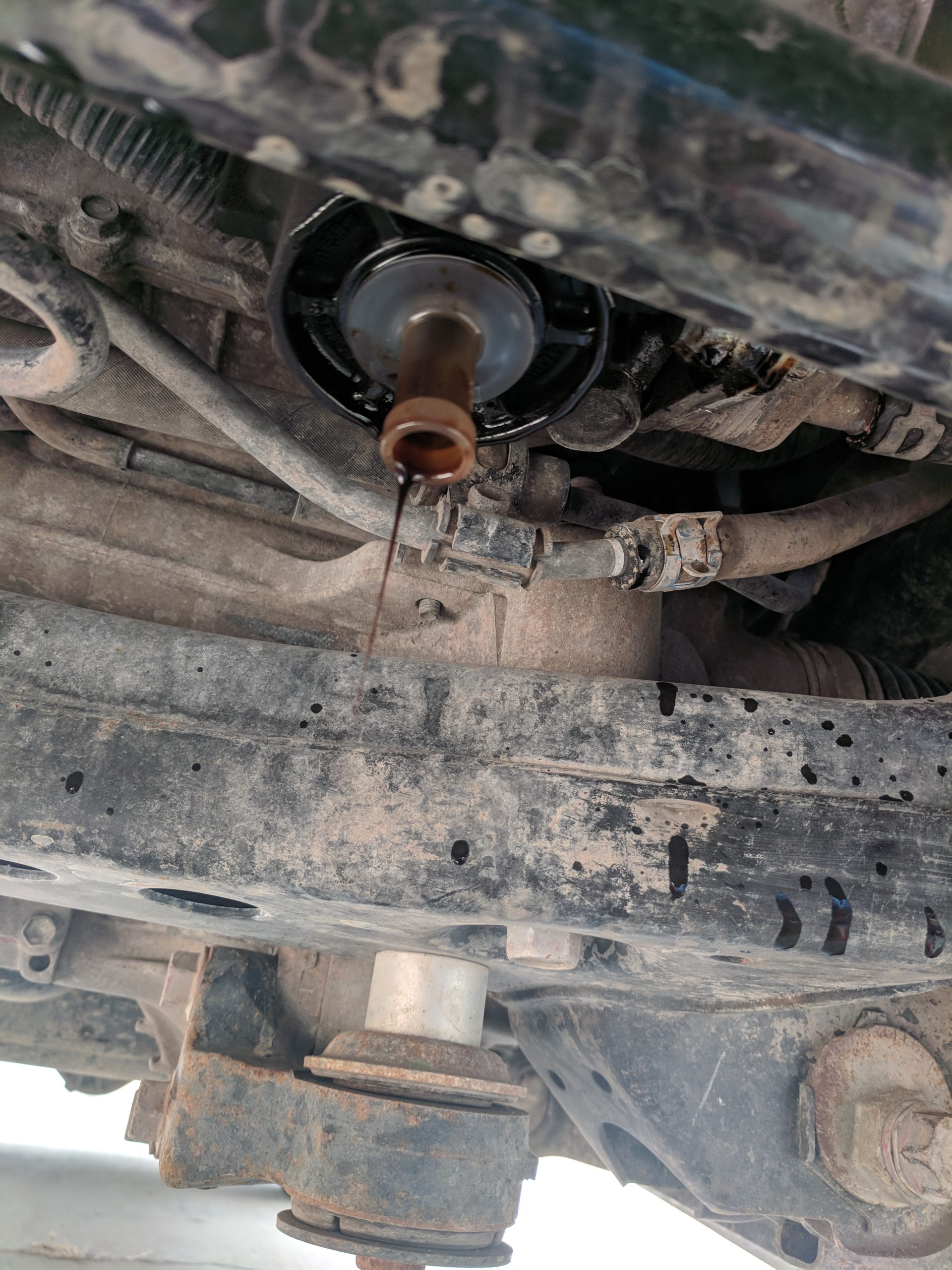 Fill with just under 8 liters of oil and then start the motor. Let it run for 30 seconds or so to build up oil pressure and circulate the oil. Back the truck off the ramps and shut off the motor. Check the dipstick for the oil level. Also, take one last look under the motor for leaks. If everything is dry, install the skid plate and you are done!