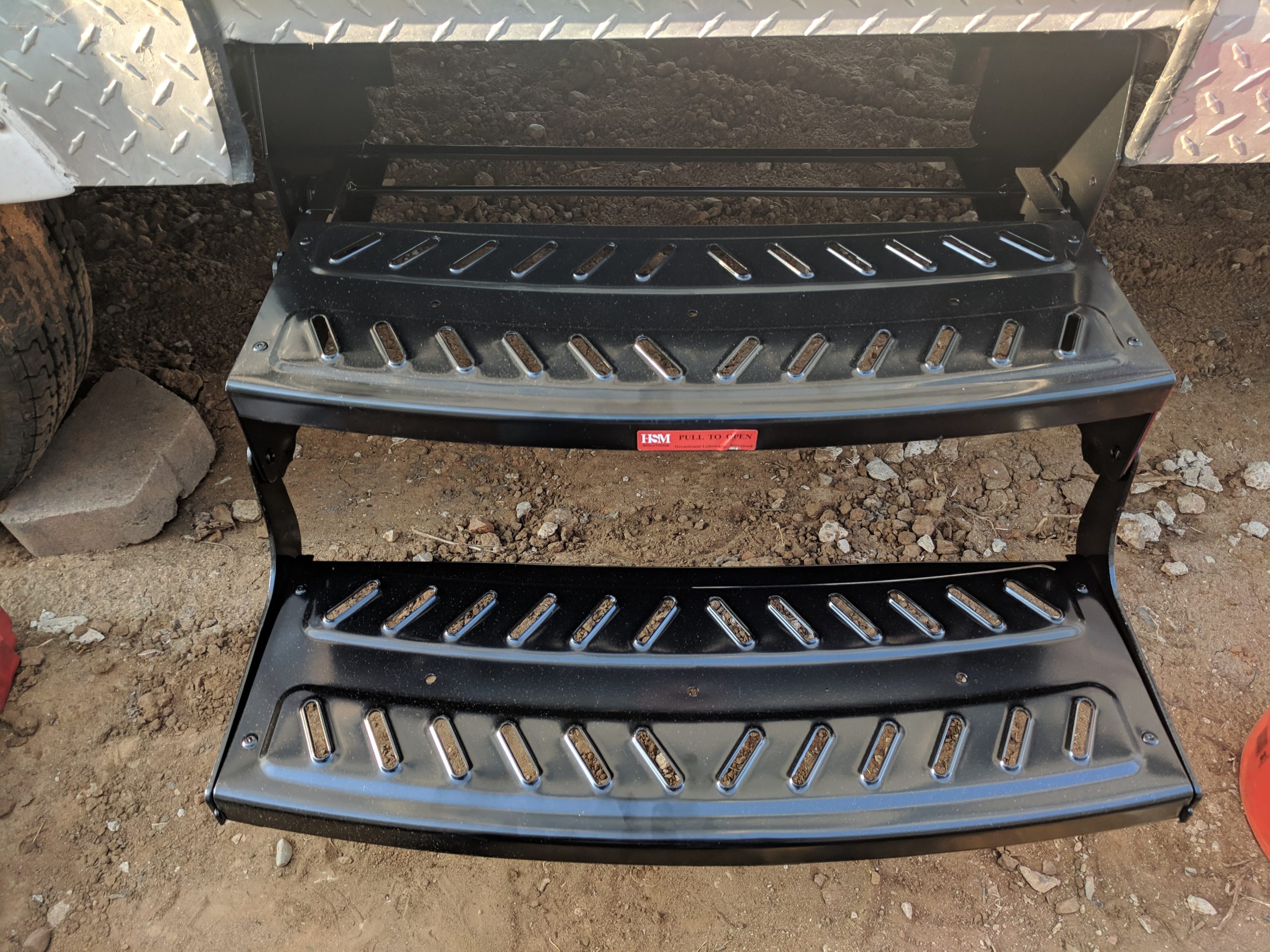 The new steps that I ordered had the same two steps as the ones I was replacing. It was made by a different company and the sliding mechanism of the old one was replaced by a hinge on the new one. This made for smoother action, pulling it out, and didn’t seem like it would be able to bind up as much from dirt.