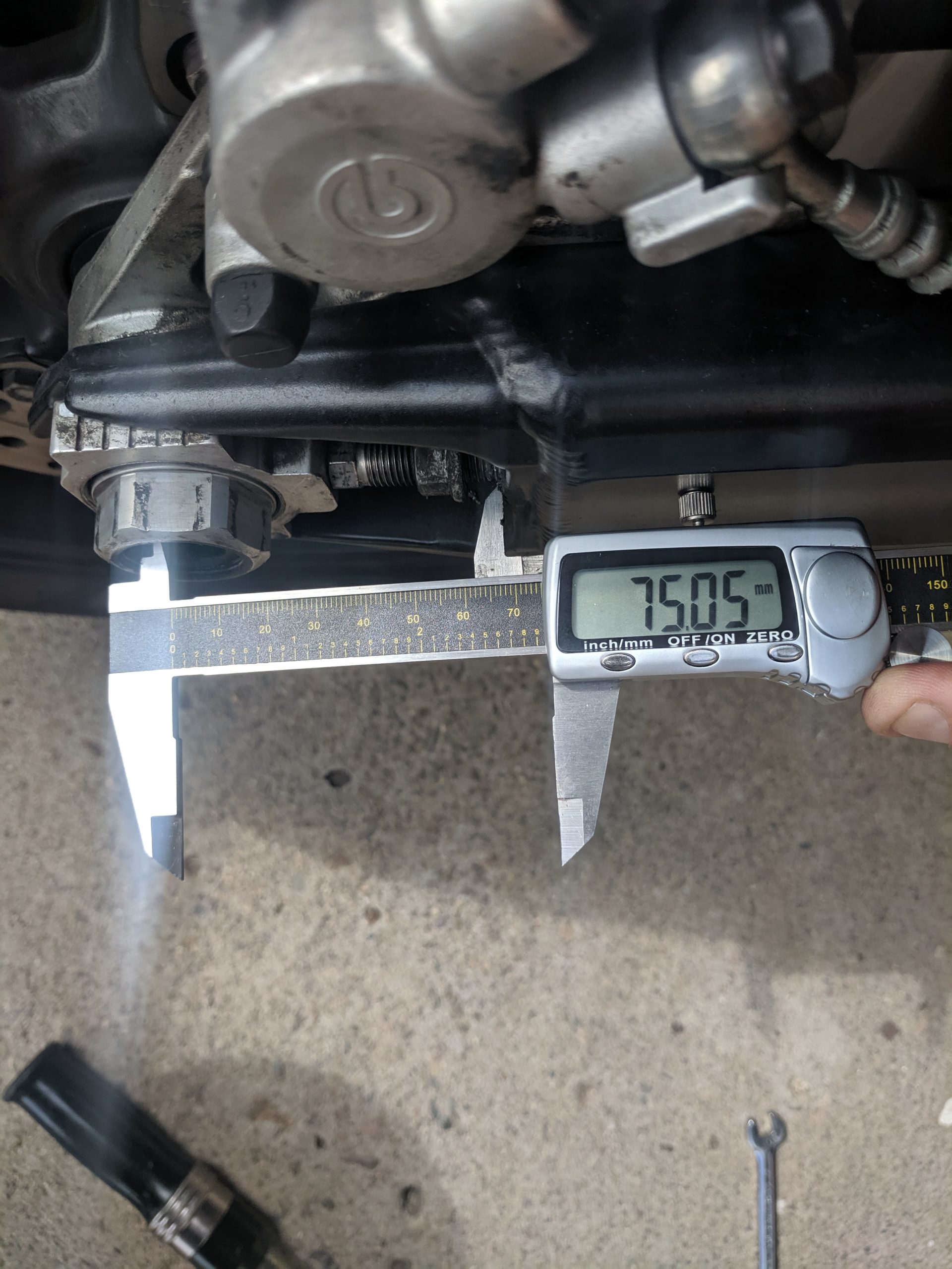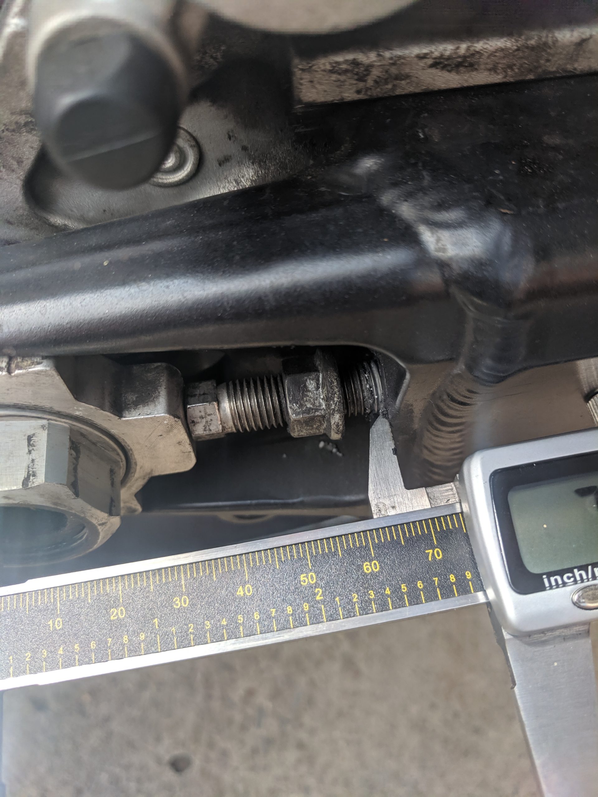 To center the wheel in the swingarm, use the digital caliper to fine-tune your adjustments. To make sure you are getting an accurate reading, use it as socket extension to wedge between the chain and sprocket. Roll the bike backward so that sprocket takes the slack out of the chain. Using the digital caliper measure from where the adjuster nut contacts the swingarm to the centerline of the axle on both sides. Use the adjuster bolt to get the axle the street is possible.