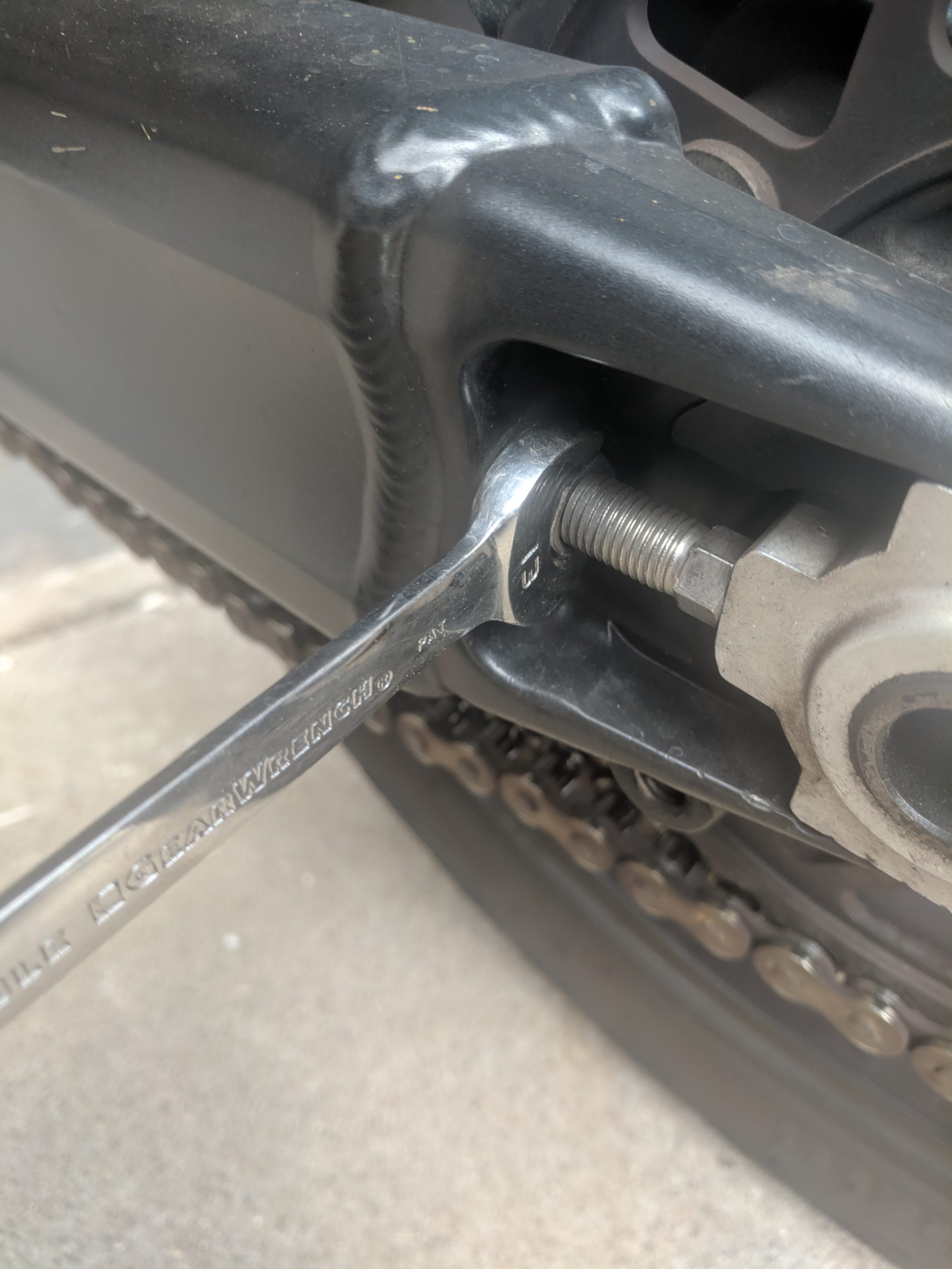 The second step is to loosen the nuts on the chain adjuster bolts. On my bike, I used my gear wrenches for this. One was 13mm and the other was 10mm. While holding the bolt with the 10mm wrench, loosen up the nut with the 10mm wrench. Repeat this for the other side.