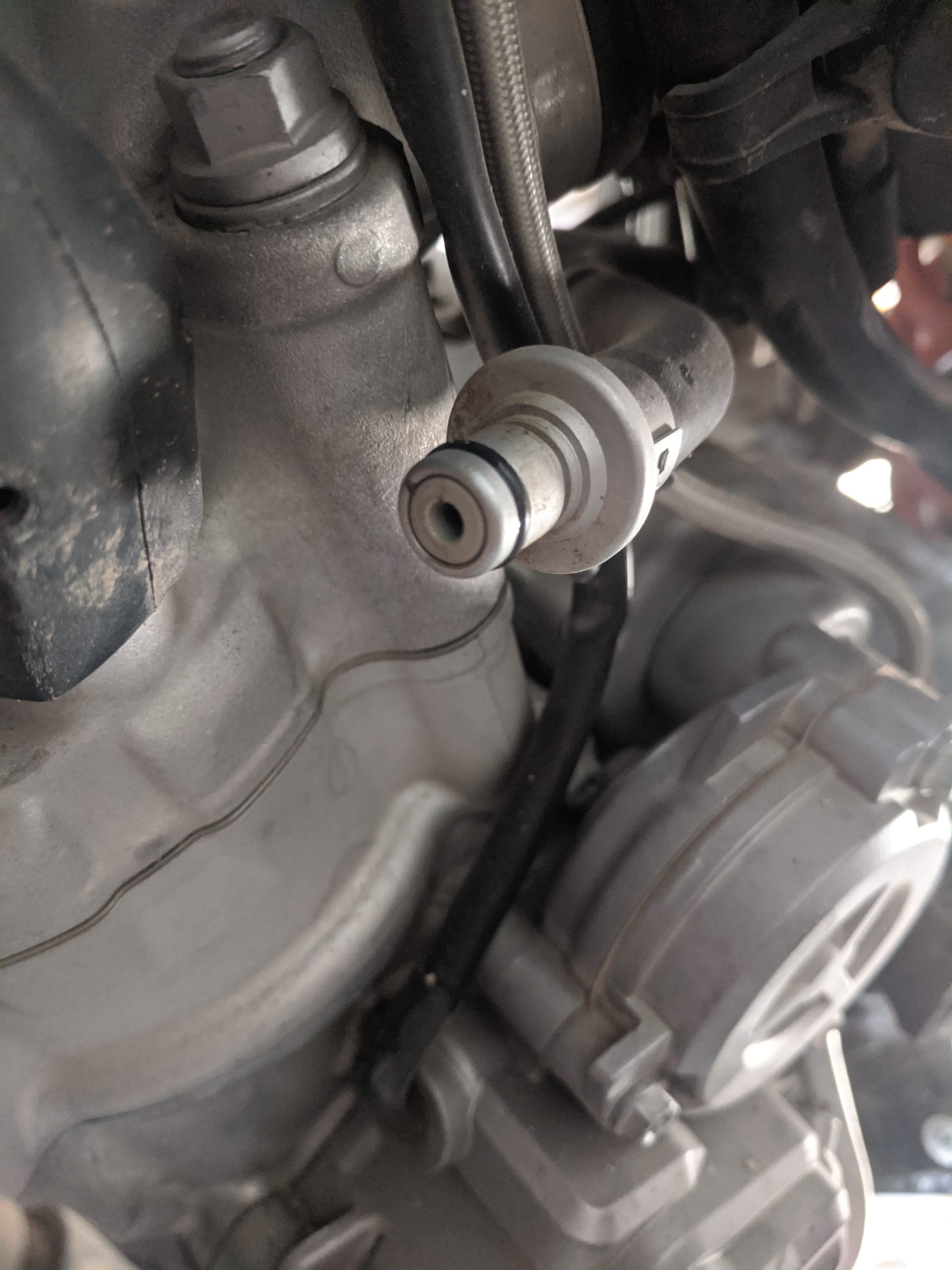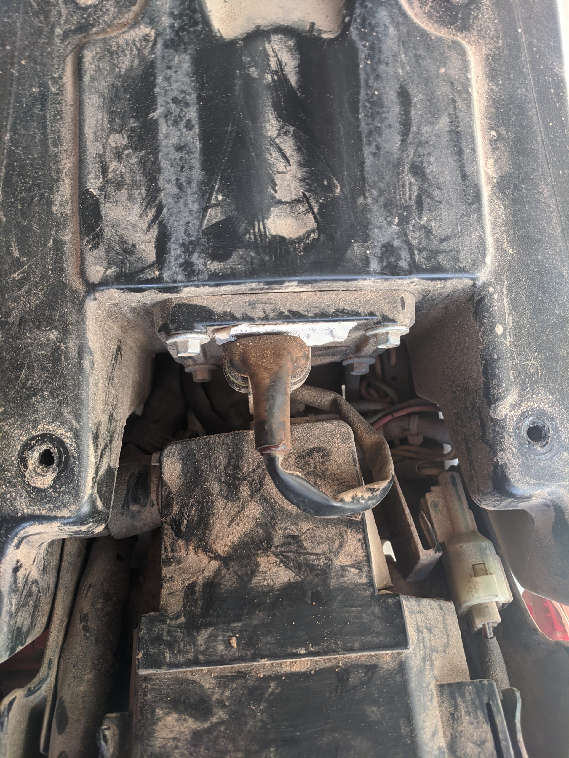 The spark plug boot is aligned directly under part of the frame. It’s a bit tricky to get out and it comes out on one side only. If you look at the bike from the top, the spark plug boot comes out on the right-hand side. It’s a tight fit but you can see that there’s a notch in the frame to give you a little room to pull the boot out. In the third picture, you can see there is a notch in the small part of the frame right above the spark plug hole.