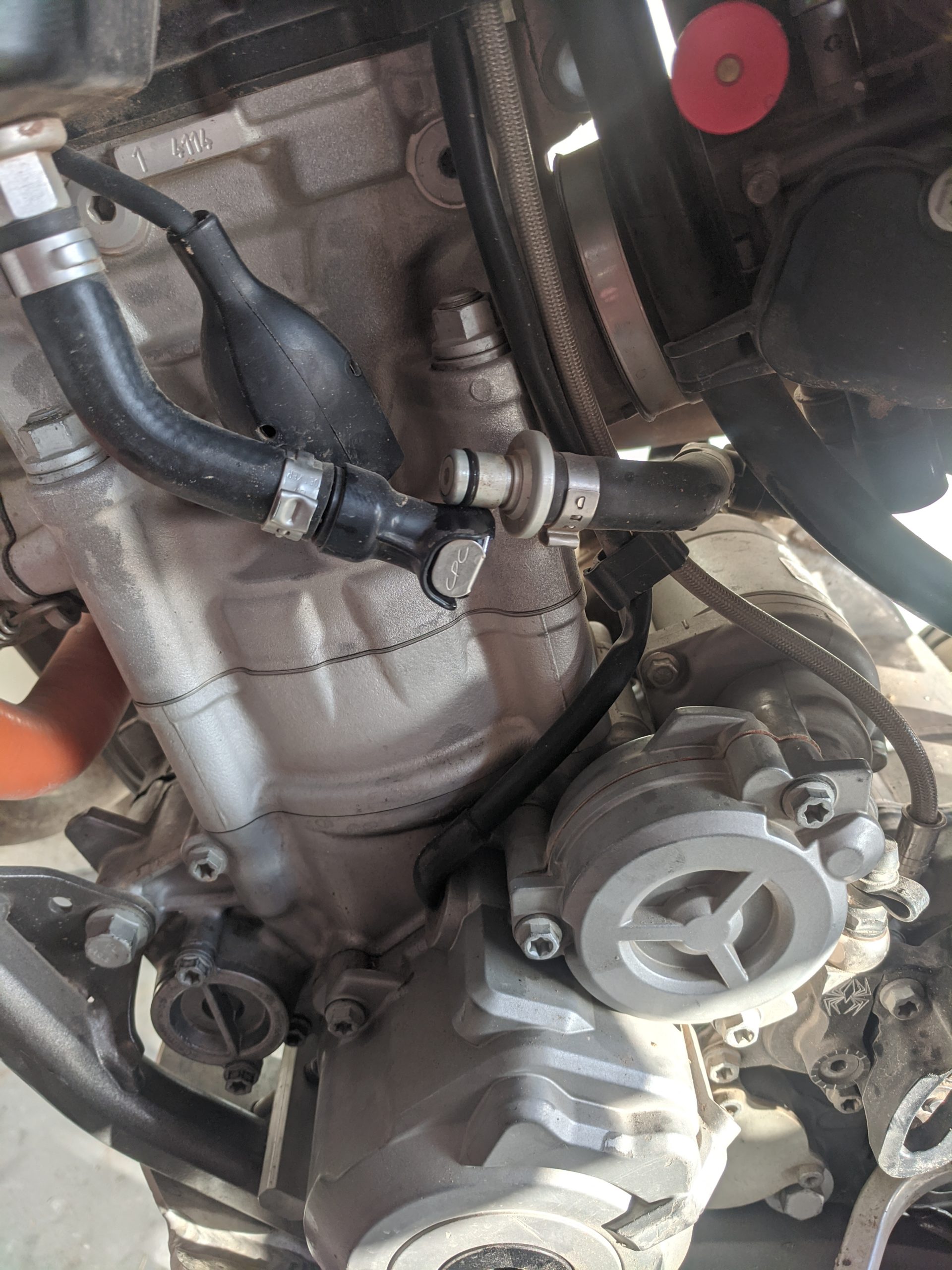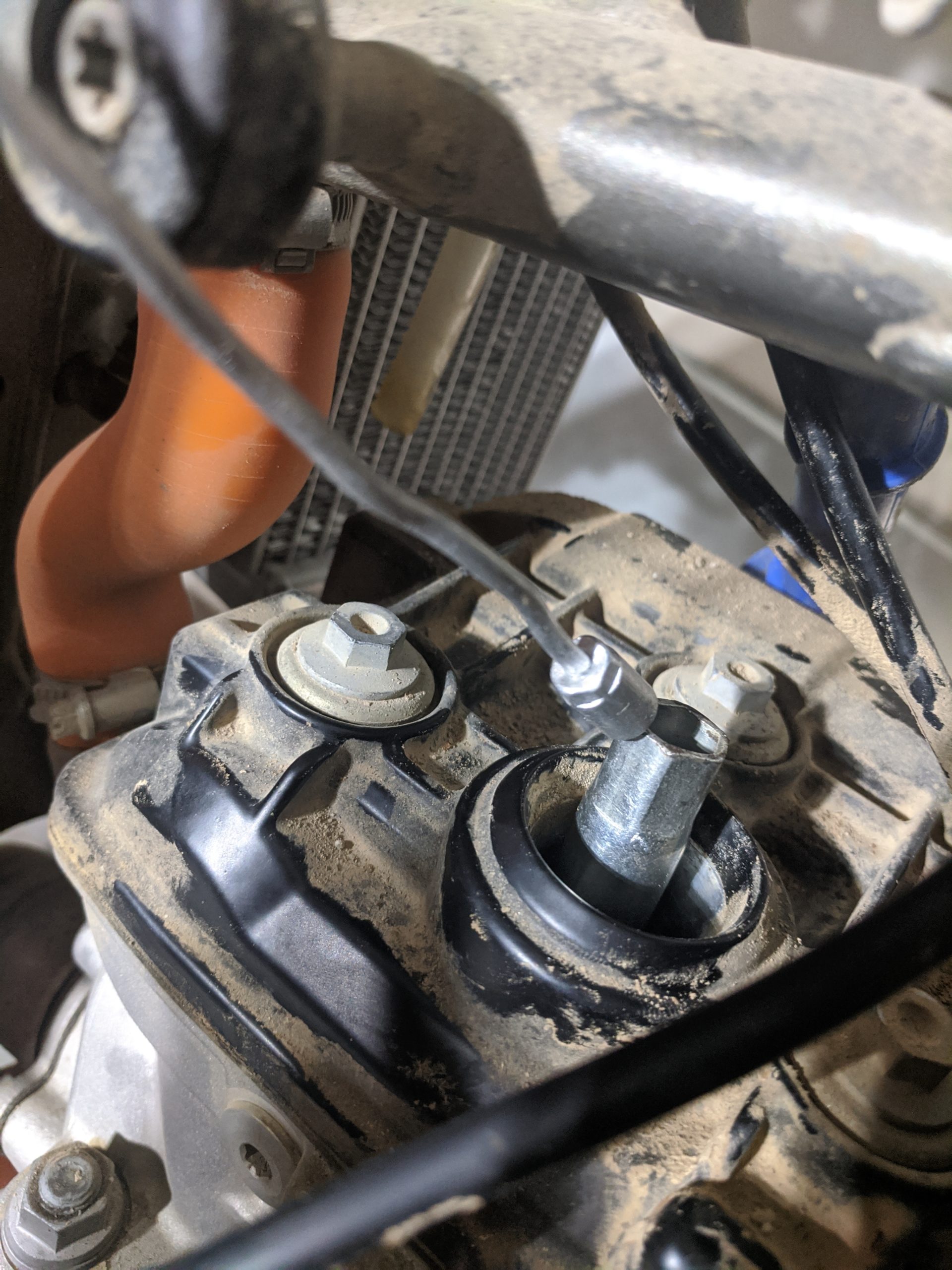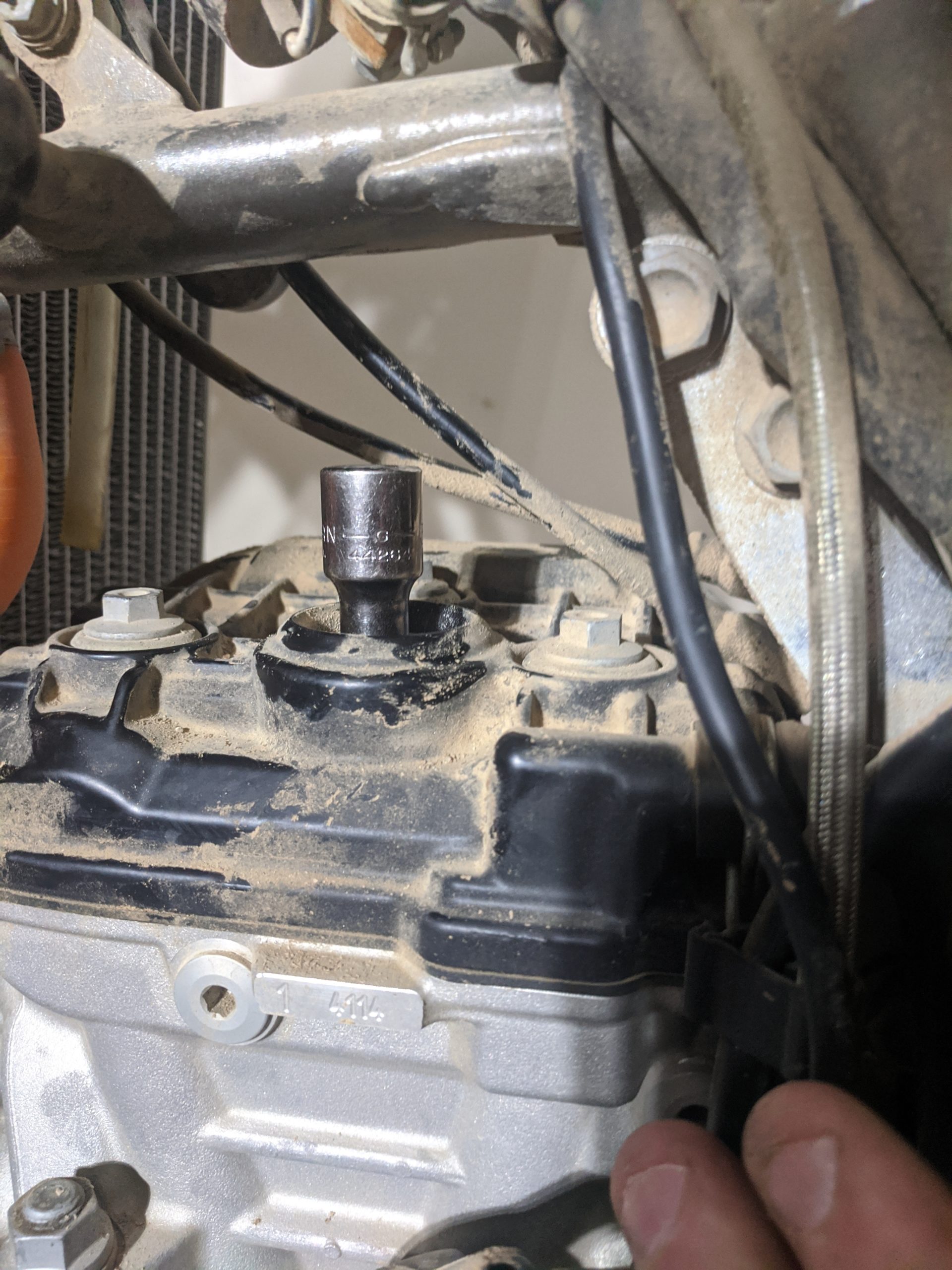 In the next three pictures, you can see why you need the socket and socket extension to reach down to the spark plug. The spark plug hole is pretty deep and you can’t directly access it with just the spark plug socket tool from KTM. Additionally, directly above the spark plug tube is a part of the frame. Using the 3-inch extension will give you just enough room to loosen the spark plug without hitting the frame.