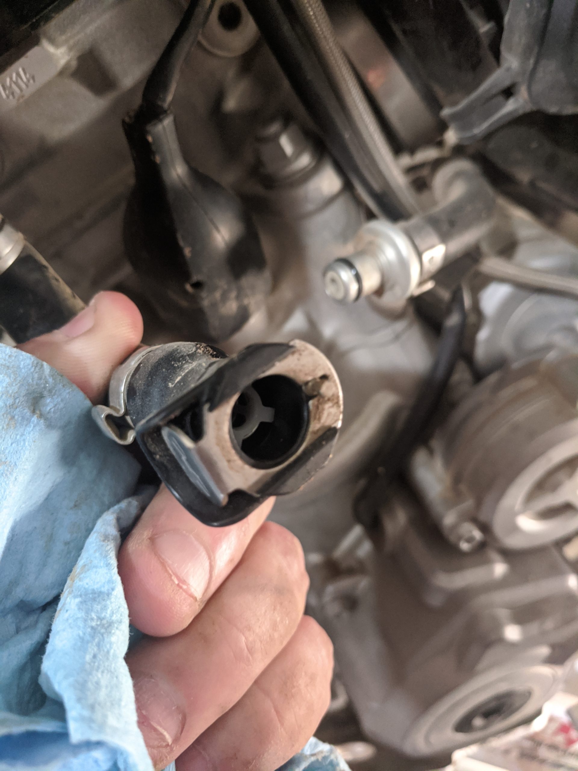 To remove the socket and the spark plug, it’s really convenient to have a bendable magnetic pickup. I said before, this is one of the tools I use all the time. The spark plug socket will slide out of the wrench and it will sit down in the spark plug tube. I found that using the magnetic pickup I could grab the socket and then after that the spark plug itself.